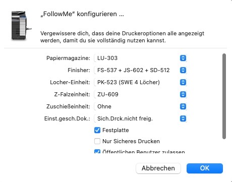 - Achtung: Zuordnung: Führen Sie einen Testdruck aus und geben Sie dem IT-Team bescheid. Der Mac-Benutzer muss nun dem Netzwerkbenutzer zugewiesen werden. Dies ist ein einmaliger Vorgang pro Gerät. Anschließend kann der FollowMe-Dienst in gewohnter weise verwendet werden.