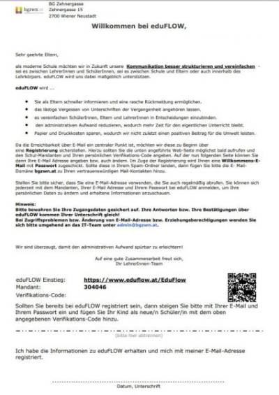 Zu Schuljahresbeginn erhalten alle Elternteile einen Willkommensbrief. D.h. wurden Mutter und Vater bei der Schulanmeldnung als 2 Personen angelegt, erhalten beide Elternteile einen eigenen Brief und somit jeweils einen eigenen Zugang zum edu.Suite-Portal. Sie werden gebeten mittels QR-Code oder Einstig ins eduFLOW-Portal Ihre E-Mail zu verifizieren und somit Ihr E-Mail-Postfach zu bestätigen. Bitte unterzeichnen Sie den Brief uns geben Sie ihn dem Klassenvorstand retour.