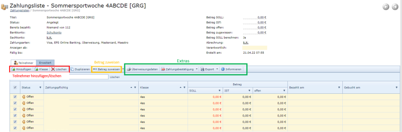 Nachdem das Sachkonto hinzugefügt worden ist, und alle Beträge vorgeschrieben sind, kann die Zahlungsliste veröffentlicht (freigegeben) werden. Anschließend ist Sie für die Teilnehmer sichtbar!